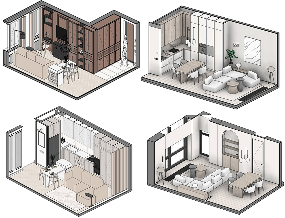 3. طراحی سه بعدی: بر اساس طراحی دو بعدی، طرحهای سه بعدی برای مشتری ارائه میشوند تا او بتواند تصور دقیقی از فضای نهایی داشته باشد.